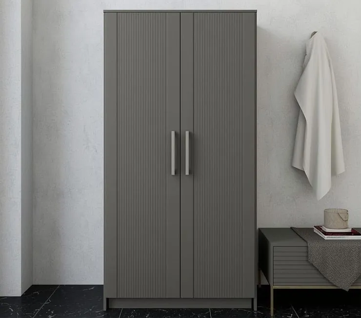 Небольшой корпусный шкаф с фасадами из МДФ, окрашенными в матовый графит. Вертикальная фрезеровка придаёт текстуру и глубину, а удлинённые ручки подчёркивают вертикаль фасада. Корпус выполнен из ЛДСП Egger, фурнитура — Blum или Hettich. Идеальное решение для прихожей или небольшой гардеробной зоны.