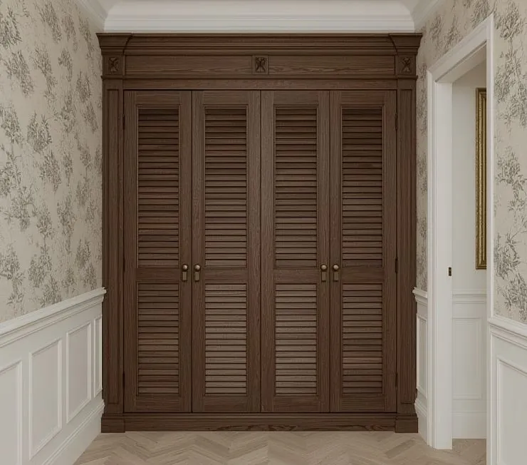 Элегантный встроенный шкаф, выполненный из МДФ со шпоном дуба тёмного оттенка. Жалюзийные фасады придают лёгкость и выразительность, а классический карниз с декоративными резными элементами подчеркивает стиль. Идеально подходит для коридора, прихожей или гардеробной в классическом интерьере.
