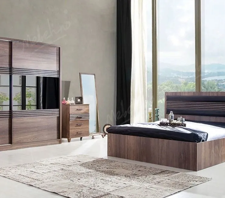 Шкаф-купе входит в изысканный мебельный гарнитур, также включающий кровать, комод, прикроватные тумбы и зеркало