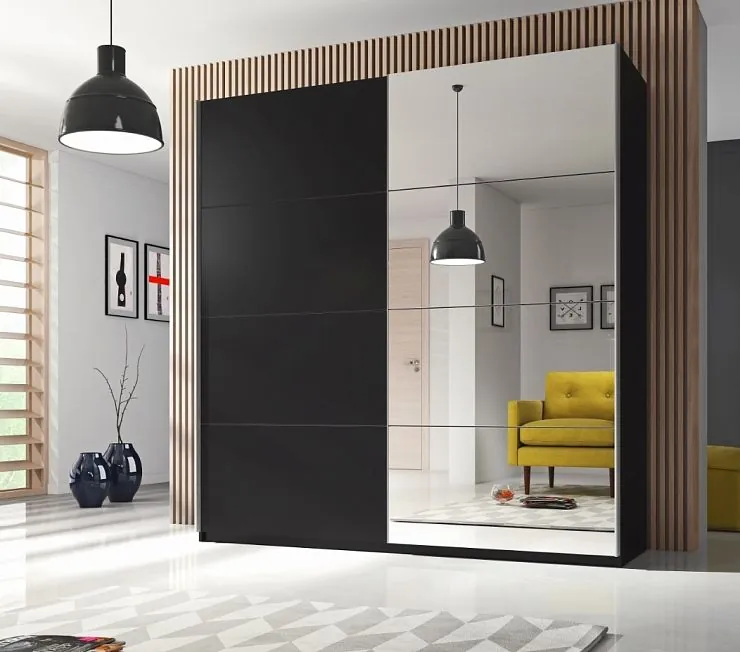Интересный вариант для тех, кто предпочитает мебель в современном дизайне. Комбинированный фасад - черная матовая эмаль и зеркальная створка - выглядит лаконично и стильно. Двухдверный шкаф «под потолок» выполнен из австрийской ЛДСП “Эггер” с фурнитурой Блум. Внутреннее наполнение - секция со штангой, антресоль, ящики, открытые полки. Выпускается по индивидуальным размерам.