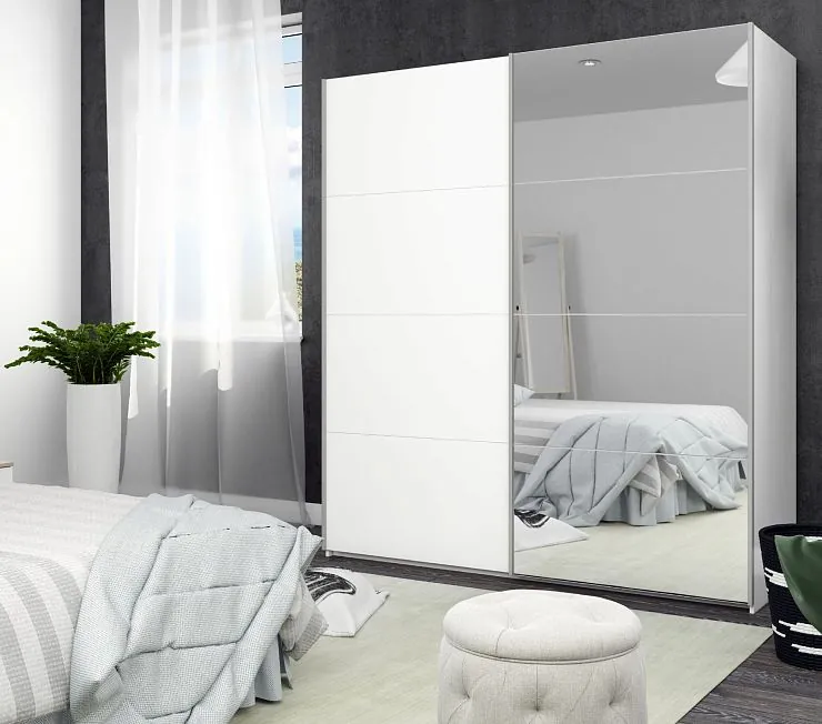 Компактная модель с комбинированным зеркальным фасадом гармонично впишется в любой современный хай-тек или сканди интерьер. Небольшие размеры при большой вместимости - отличное решение для спальни или гостиной с невысокими потолками. Шкаф-купе изготавливается из МДФ, для раздвижной системы и ящиков используется надежная фурнитура Hettich. Мебель производится по индивидуальным параметрам помещения.