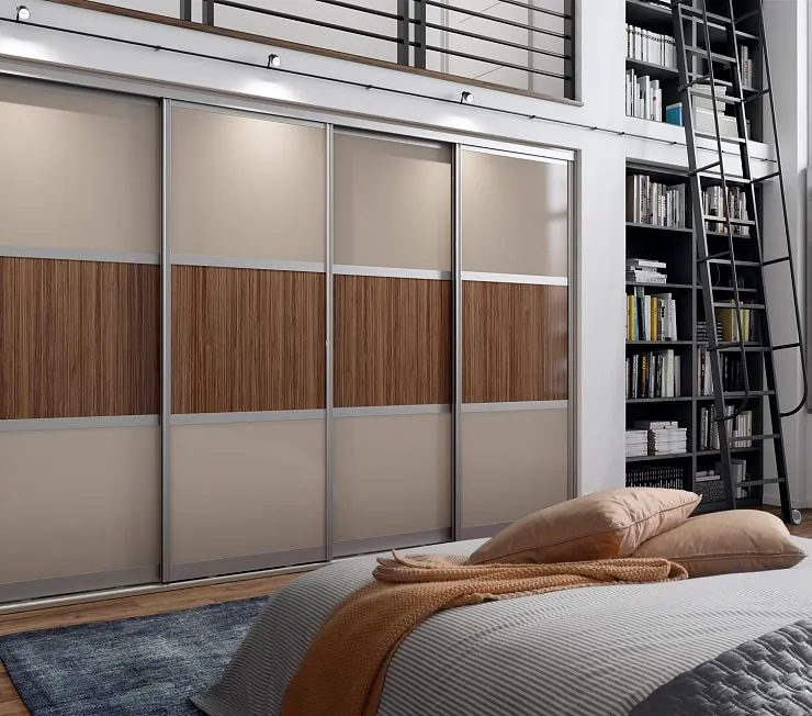 Четырехдверная модель-купе с комбинированными фасадами, которые сочетают вставки матового серого и пленки под дерево. Материал - премиальный МДФ, фурнитура - Blum (Австрия). Надежная и бесшумная система купе на алюминиевой раме. Вместительный встраиваемый шкаф подойдет для спальни или гостиной. Производится по размерам ниши, только на заказ.
