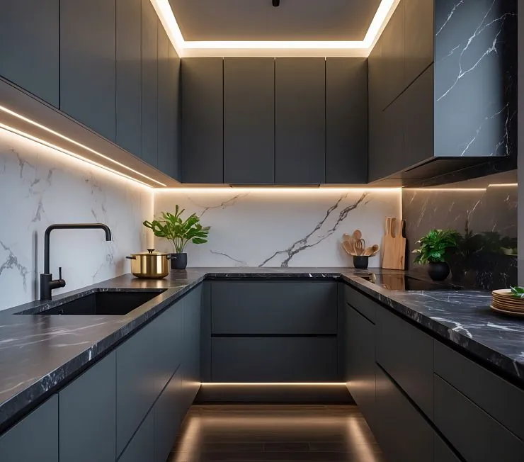 Элегантная кухня в современном стиле с L-образной планировкой. Комбинация матовых тёмно-графитовых фасадов и чёрного мрамора с белыми прожилками создаёт премиальный образ. LED-подсветка подчеркивает линии гарнитура, придавая интерьеру глубину и уют.