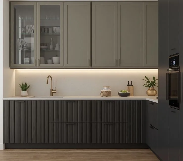 Стильная L-образная кухня в современном исполнении с комбинированными фасадами: нижние шкафы выполнены в графитовом цвете с вертикальным рифлением, а верхние – в спокойном оливково-сером тоне с матовыми дверцами и частично стеклянными витринами. Такая комбинация оттенков создаёт гармоничный баланс строгости и лёгкости. Подсветка рабочей зоны добавляет уюта и подчёркивает фактуры. Встроенная техника и эргономичная планировка делают кухню максимально удобной и функциональной.