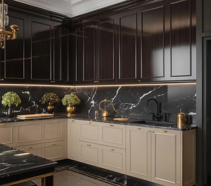 Роскошная L-образная кухня в классическом стиле с современными акцентами. Верхние фасады выполнены в тёмно-шоколадном глянце, нижние — в мягком бежевом матовом оттенке. Эффектный фартук и столешница из чёрного мрамора с белыми прожилками добавляют глубину и благородство интерьеру. Золотая фурнитура и акценты подчёркивают изысканность и премиальный характер кухни.