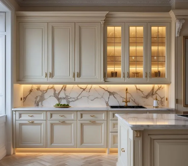 Роскошная классическая кухня с фасадами в бежевом тоне и панелями с изящным фрезерованным рисунком. Мраморный фартук с выразительной текстурой придаёт интерьеру благородство и утонченность. Стеклянные шкафы с подсветкой идеально подходят для демонстрации посуды и аксессуаров. Золотая фурнитура и смеситель создают ощущение гармонии и роскоши.