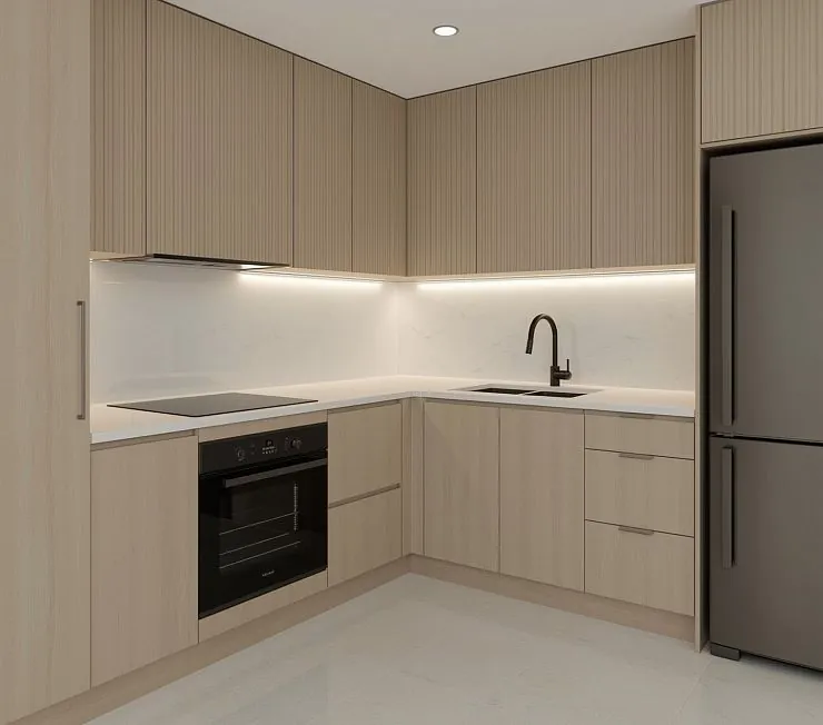 Современная L-образная кухня в скандинавском стиле с фасадами из светлого дерева. Вертикальные линии верхних шкафов создают динамику, а скрытая подсветка рабочей зоны добавляет лёгкости и уюта. Идеальное решение для квартир-студий и современных интерьеров.