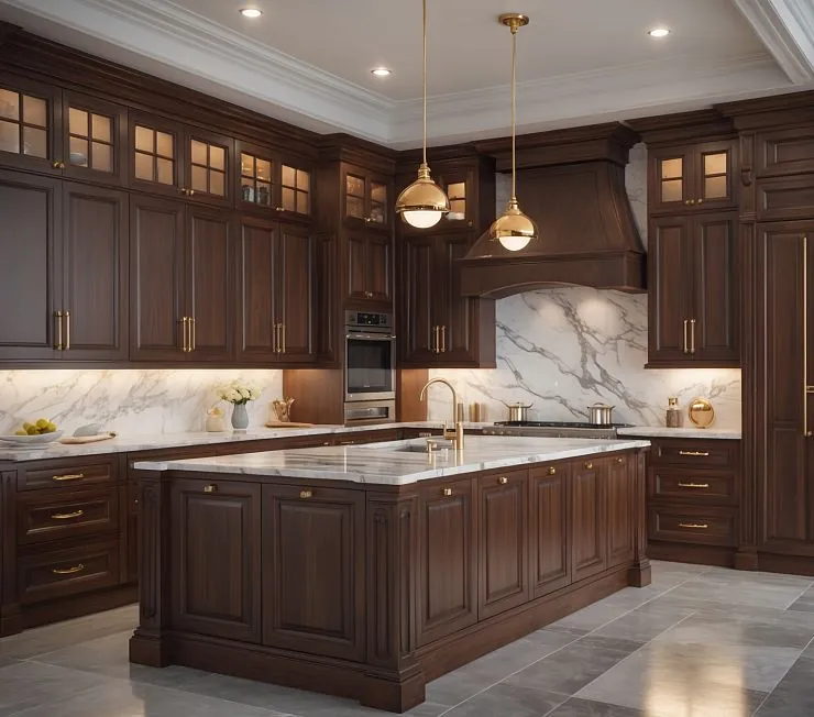 Роскошная классическая кухня из тёмного ореха с массивными фасадами и элегантной фрезеровкой. Центральное место занимает большой остров с мраморной столешницей и встроенной мойкой, идеально подходящий для готовки и сервировки. Натуральный камень в отделке фартука и столешниц гармонично сочетается с глубоким оттенком древесины, создавая атмосферу уюта и аристократизма. Золотая фурнитура и подвесные светильники подчёркивают премиальный характер интерьера.