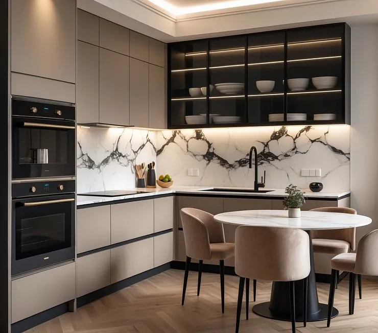 Элегантная U-образная кухня в стиле современный минимализм с акцентом на контраст фактур и подсветку. Нижние фасады выполнены в матовом бежево-какао тоне с интегрированными ручками, верхние шкафы — из чёрного матового стекла с LED-подсветкой. Фартук и столешница из керамогранита с рисунком «мрамор Калькатта» с выразительными чёрными прожилками.