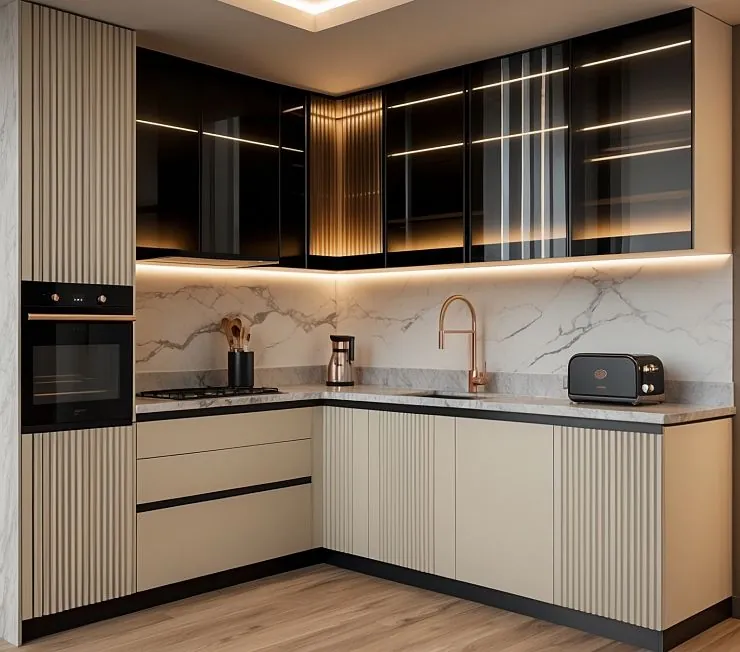 Эта U-образная кухня выполнена в стиле современной итальянской классики, где строгая геометрия сочетается с премиальными материалами. Нижние фасады в светлом матовом бежевом оттенке украшены вертикальными фрезеровками, создающими ритм и визуальную динамику. Верхние шкафы выполнены из чёрного стекла с LED-подсветкой, что придаёт интерьеру лёгкость и глубину.