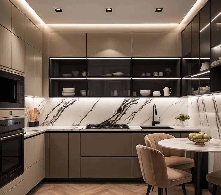 Эффектная современная U-образная кухня в стиле luxury minimalism. Матовые фасады в бежево-какао оттенке гармонично сочетаются с верхними шкафами из чёрного стекла с LED-подсветкой. Столешница и фартук из керамогранита с рисунком «мрамор Калькатта» с яркими чёрными прожилками создают роскошный акцент.