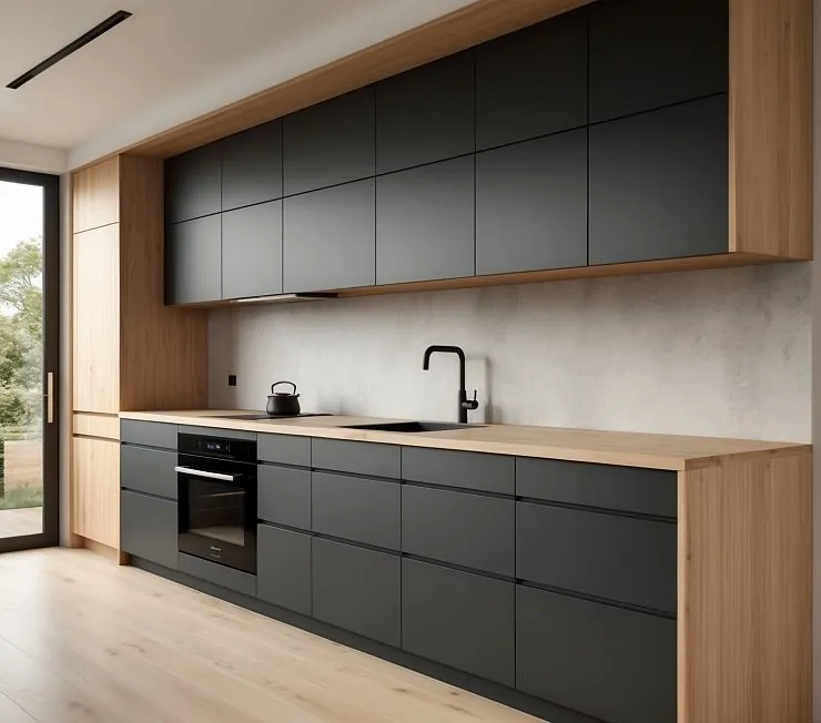 Прямая кухня в стиле современного скандинавского минимализма. Сочетание матовых графитово-чёрных фасадов и натурального светлого дуба создаёт гармоничный и уютный интерьер. Кухня идеально подходит для квартир-студий или домов с панорамными окнами, где ценится лаконичность и функциональность.