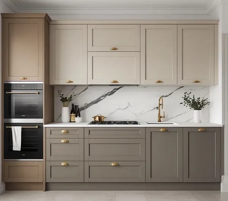 Сдержанная и элегантная кухня с матовыми фасадами из МДФ в оттенках капучино и светлого бежевого. Лаконичная фрезеровка подчёркивает геометрию, а вставки из золота в фурнитуре добавляют премиальности. Встроенные духовые шкафы, каменная столешница и мраморный фартук завершают образ современной кухни в спокойных тонах. Возможна адаптация под размеры и планировку помещения.