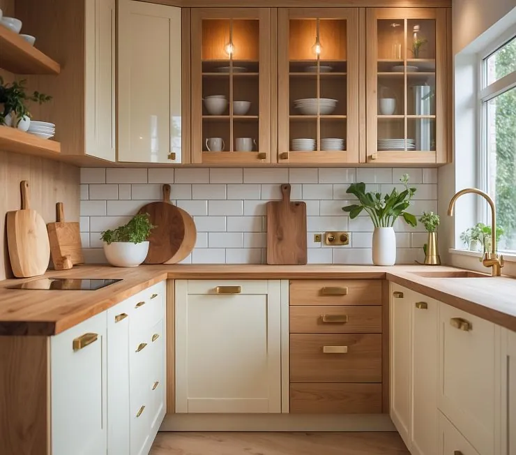Скандинавская кухня с двухцветными фасадами: тёплое дерево и молочный матовый оттенок. Верхние шкафы с витринами и подсветкой создают лёгкость и уют, а открытые полки позволяют добавить индивидуальности. Столешница из массива гармонично перекликается с фасадами и делает интерьер особенно тёплым. Лаконичный фартук из плитки «кабанчик» подчёркивает стиль, а золотая фурнитура добавляет нотку элегантности.