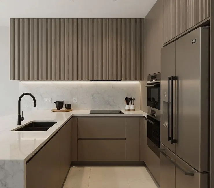 U-образная кухня в современном стиле, выполненная в благородном тауповом оттенке с рифлёными фасадами верхних модулей. Лаконичный дизайн подчёркивается матовыми гладкими фасадами нижних шкафов и интегрированными ручками. Светлая каменная столешница и фартук с мягким мраморным рисунком создают лёгкий и изысканный фон. Встроенная техника и вместительный холодильник side-by-side обеспечивают максимальный комфорт и функциональность.