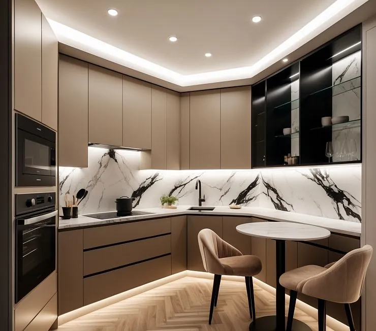 Современная U-образная кухня с матовыми фасадами в тёплом бежево-какао оттенке. Элегантный акцент — мраморный фартук с выразительными чёрными прожилками, дополненный LED-подсветкой. Встроенный столик с мягкими креслами создаёт уютное пространство для завтраков или чашки кофе.