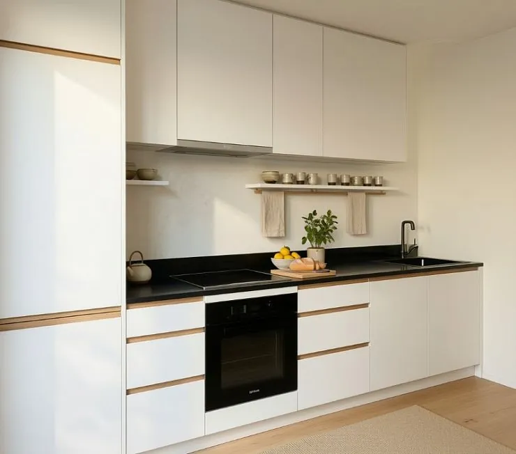 Прямая кухня в стиле Japandi — искусство простоты в каждой детали. Линейная планировка шириной 2,5 метра сочетает японскую философию «ничего лишнего» со скандинавской теплотой натуральных материалов. Матовые фасады из окрашенного МДФ в мягком кремовом оттенке дополнены деревянными вставками из светлого дуба, которые заменяют ручки и придают гарнитуру тактильную выразительность — хочется провести рукой по каждой линии.