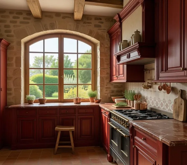 В центре композиции — профессиональная газовая плита с двойной духовкой в чёрно-латунном исполнении, увенчанная массивным каминным порталом вытяжки с открытой полкой для провансальской керамики. Столешница из красного мрамора Rojo Alicante с кремовыми прожилками перекликается с цветом фасадов, а фартук из декоративной плитки с растительным орнаментом добавляет ту самую южную узорность. Медные сотейники на латунном рейлинге, пряные травы в глиняных горшках и деревянные разделочные доски — не декорации, а рабочие инструменты настоящей кухни.