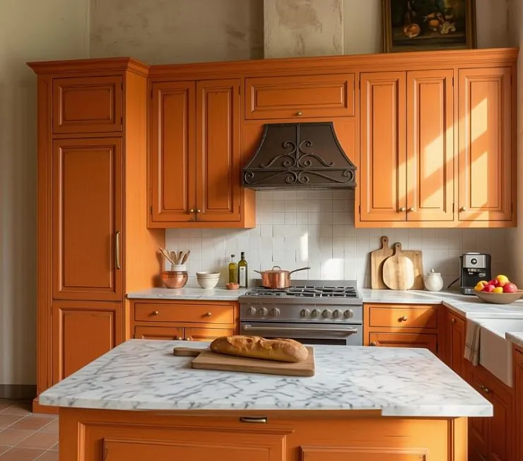 Столешницы из белого мрамора Carrara — на основном гарнитуре и на острове — создают свежий контраст с оранжевыми фасадами. Фартук из кремовой плитки ручной работы, кованая вытяжка с фигурными завитками из патинированного металла и керамическая мойка-фартук — каждый элемент отсылает к традициям французской деревни. Профессиональная газовая плита из нержавеющей стали, медные сотейники и деревянные разделочные доски — не декор, а инструменты настоящего кулинара.