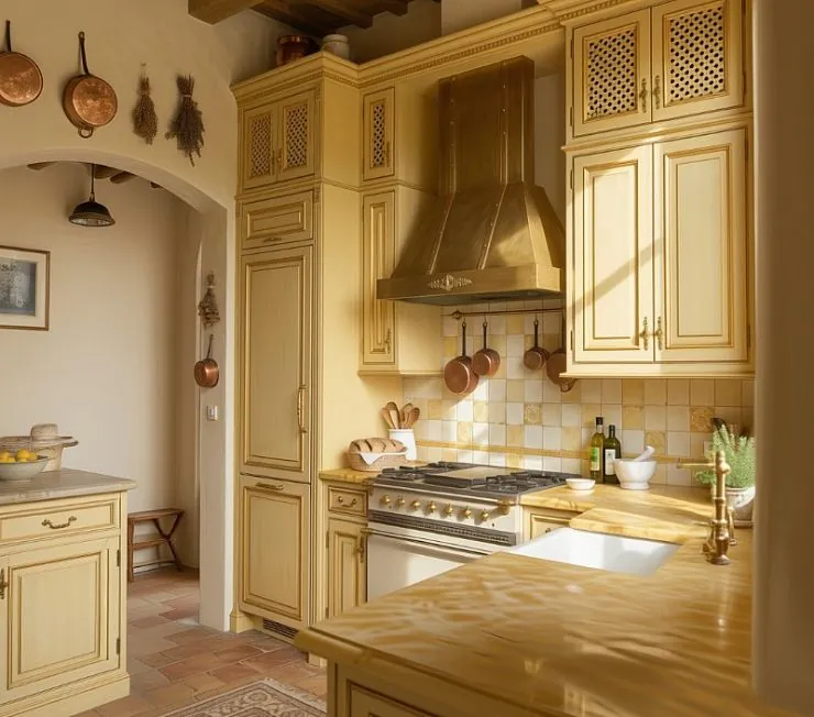Угловая кухня с полуостровом в стиле прованс — солнечное золото южной Франции в каждой детали. Г-образная планировка с длиной сторон 2,5 и 2 метра и полуостровом 1,5 метра создаёт уютное замкнутое пространство, в котором всё под рукой. Фасады из массива дерева в мягком золотисто-жёлтом тоне с лёгкой патиной сочетают классические филёнки с решётчатыми вставками ромбовидного плетения — приём, который добавляет воздуха и позволяет заглянуть внутрь шкафа, не открывая дверцу.