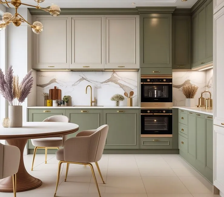 Элегантная кухня в стиле современная классика. Нижние фасады выполнены в благородном оливковом оттенке, верхние — в мягком бежевом, что создаёт гармоничный и уютный образ. Мраморный фартук с выразительным рисунком придаёт интерьеру лёгкую роскошь, а золотая фурнитура и смеситель подчеркивают утончённость дизайна.