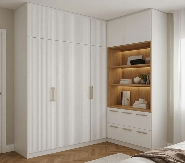 Элегантный L-образный шкаф в современном минималистичном стиле. Левая секция оснащена распашными дверцами с вертикальной фрезеровкой, а правая — функциональными открытыми полками с декоративной LED-подсветкой, создающей уютную атмосферу. Нижняя часть включает вместительные выдвижные ящики, а верхняя — закрытые антресоли для хранения сезонных вещей. Внутреннее наполнение может быть адаптировано под заказ.