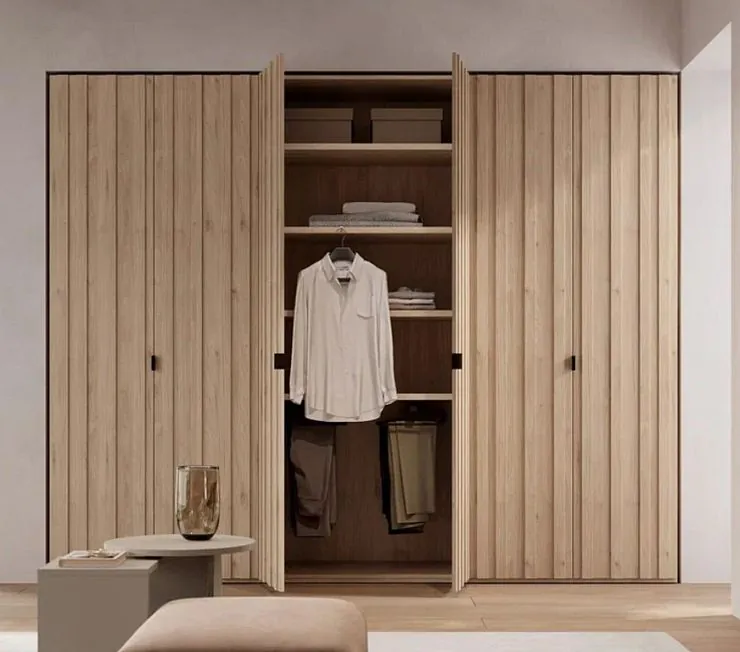 Большой распашной шкаф в стиле минимализма. Доступен в различных вариантах: для мужского гардероба – с брючным разделом, для женского – с платяной секцией, для семейного – с универсальным наполнением. Корпус выполнен из ЛДСП "Egger", двери – МДФ в шпоне. Можно выбрать массив – бук, ясень, дуб.