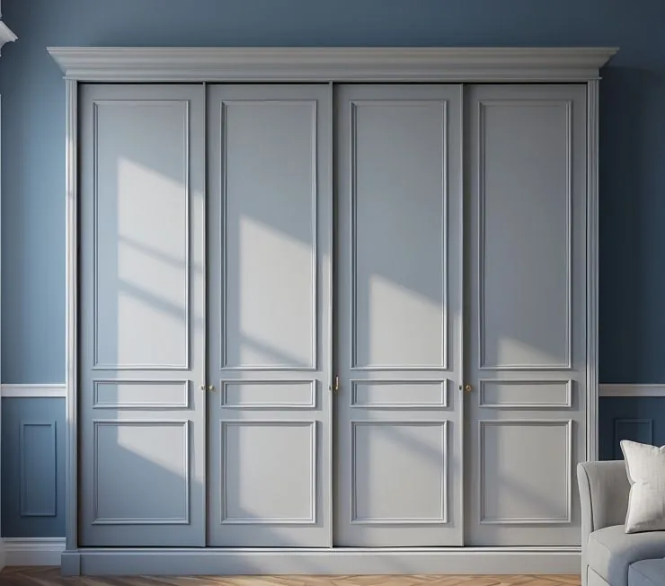 Leonardo Phoenix 10 в классическом голубом исполнении — это идеальное решение для интерьеров в стиле неоклассика, арт-деко или прованс. Четыре высокие двери с декоративной фрезеровкой и позолоченными ручками создают утончённый и статусный вид. Шкаф идеально впишется в спальню или гостиную с высокой потолочной линией.