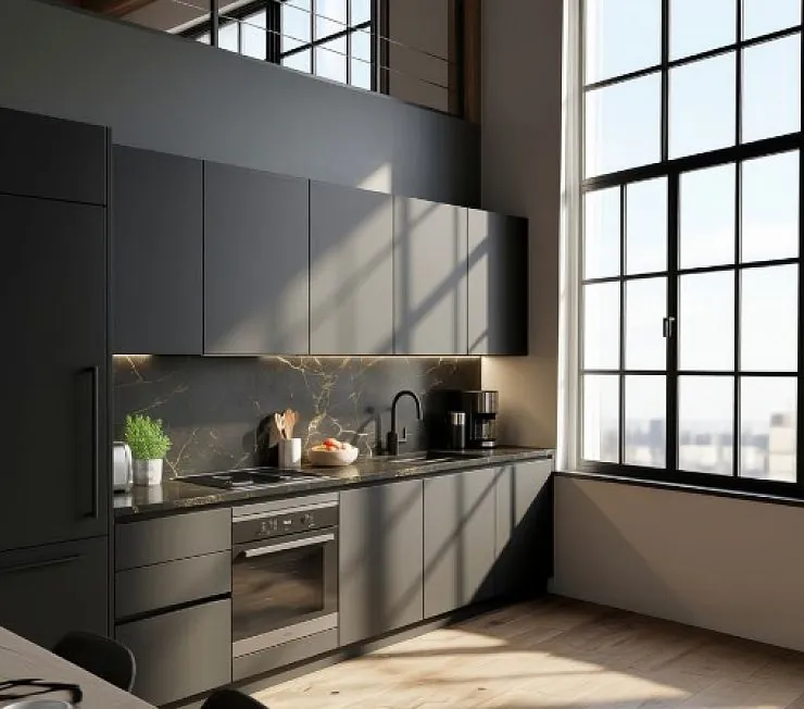Все фасады — МДФ в матовой эмали антрацитового цвета (RAL 7016), гладкие, без фрезеровки. Столешница и фартук — натуральный мрамор Noir Saint Laurent (или аналог), чёрный фон с золотистыми прожилками. Встроенная техника: индукционная панель, духовой шкаф, холодильник в колонне. Смеситель — чёрный матовый. Фурнитура — безручечная система, чёрная ручка-рейлинг на холодильнике. LED-подсветка под верхними шкафами.