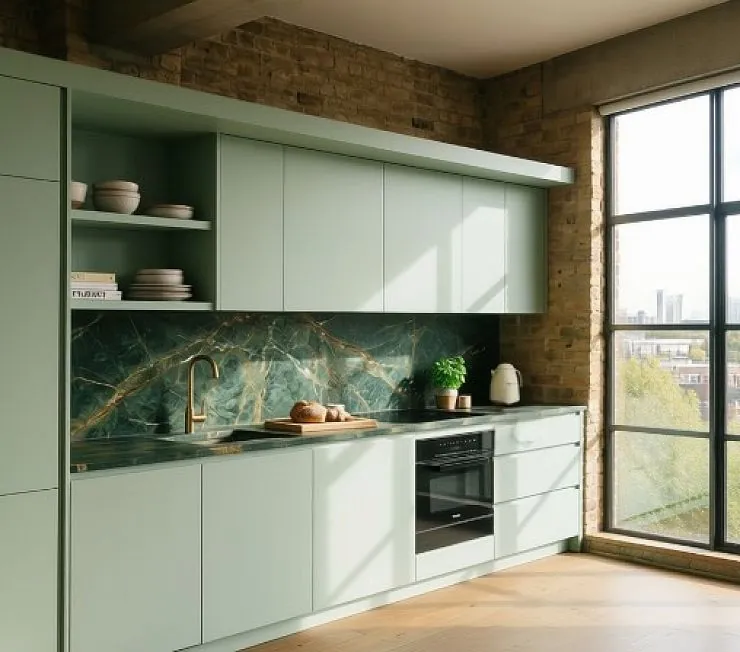 Столешница и фартук — натуральный мрамор Verde Guatemala (или аналог), тёмно-зелёный с золотисто-бронзовыми прожилками. Между колонной и верхними шкафами — открытая ниша с полками в тон фасадов. Встроенная техника: холодильник в колонне, духовой шкаф (Miele, чёрный), индукционная панель. Смеситель — матовая латунь. Фурнитура — безручечная система. Пол — дубовая доска натурального оттенка. Стены — открытая кирпичная кладка.