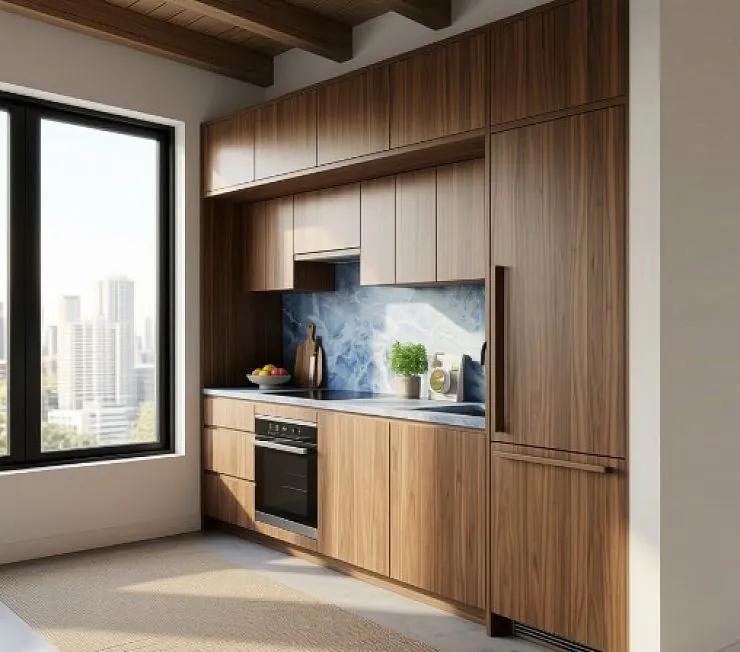 Все фасады — натуральный шпон американского ореха (walnut), гладкие, безрамочные, от пола до потолка. Столешница и фартук — голубой кварцит Azul Macaubas (или Blue Bahia), насыщенный синий с белыми прожилками. Встроенная техника: холодильник в колонне, духовой шкаф, индукционная панель, встроенная вытяжка. Смеситель — чёрный матовый. Фурнитура — интегрированные ручки-пазы. Пол — полированный бетон. Потолок — открытые деревянные балки.