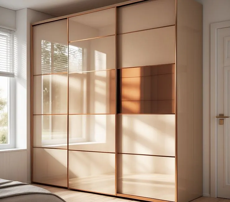 LUCENTE — это ультрасовременный шкаф-купе, в котором сочетаются глянцевая роскошь и архитектурная чёткость. Его фасады выполнены из стекла с глянцевым покрытием двух оттенков: светлый шампань и контрастный бронзово-коричневый акцент. Металлический профиль в теплой медной отделке добавляет утончённости и стиля.