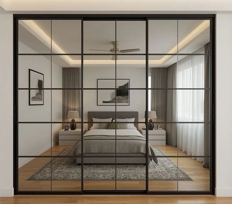 Lucid Realism | Mirror Grid — это ультрасовременный шкаф-купе с тремя зеркальными раздвижными дверями, оформленными в индустриальном стиле. Строгая геометрия чёрной алюминиевой раскладки превращает каждую дверь в архитектурный элемент, визуально расширяющий пространство и придающий интерьеру глубину и ритм.