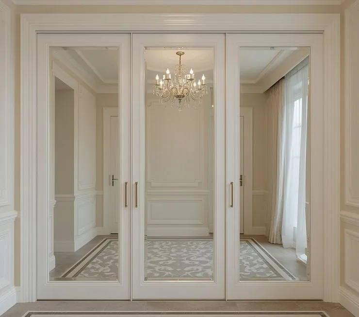 Элегантный встроенный шкаф-купе с тремя высокими зеркальными створками в изысканной классической рамке. Белоснежная отделка и массивный карниз придают изделию благородство, а зеркальные панели наполняют помещение светом и делают его визуально просторнее. Идеальное решение для светлых интерьеров в стиле неоклассика, модерн или арт-деко.