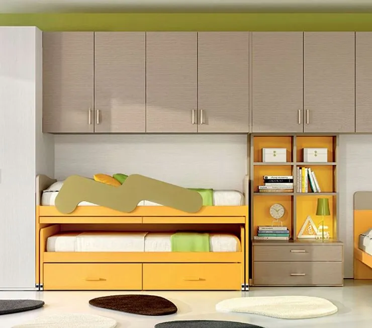 Комплект включает вместительные системы хранения, отдельно стоящую, а также 2-х ярусную кровать с выдвижным нижним ярусом. Спальных мест достаточно для комфортного сна и отдыха троих детей. Лаконичные формы, качественное исполнение из ЛДСП “Egger” (Австрия) с прочной кромкой из ПВХ, яркие оттенки и надежная фурнитура Hettich - полный набор преимуществ для детской комнаты. Для изготовления нужен точный замер размеров помещения.
