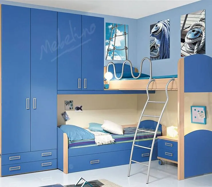 Функциональный вариант, где есть два спальных места, вместительный шкаф с открытыми боковыми полками и тумба.