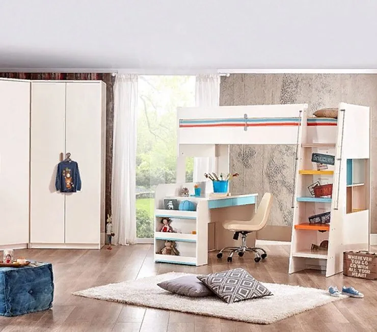 Комплект состоит из кровати-чердака с рабочим местом, углового шкафа с открытым боковым стеллажом и комода с зеркалом.