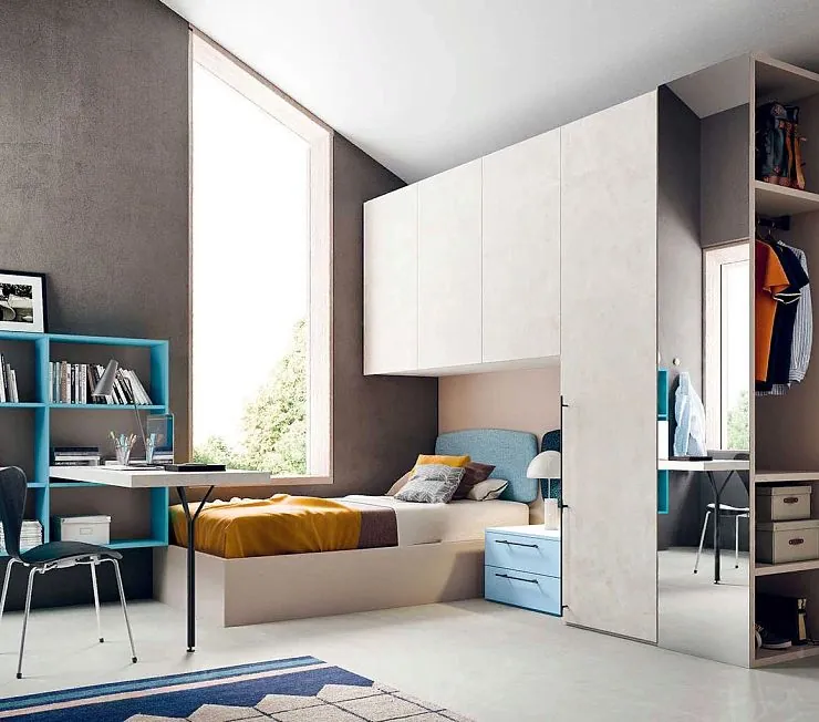 Суперкомпактный гарнитур, спроектированный для размещения в небольших комнатах с диагональным потолком. Зеркальный фасад шкафа с push-механизмом визуально расширяет пространство. Напольные шкафчики без внешней фурнитуры выглядят современно и технологично, что дополнительно подчеркивает серая лаконичная цветовая гамма. В составе - навесные полки и небольшая прикроватная тумба. Производство возможно только после замера комнаты.