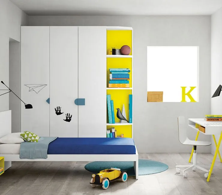 Яркие оттенки, практичность и удобство делают этот набор мебели из МДФ с прочной ПВХ пленкой отличным выбором для компактной детской комнаты. Шкаф со стеллаж-колонной, подвесная прикроватная тумбочка-полка, стол с секцией для хранения – все продумано до мелочей. Детская делается под заказ, по необходимым размерам.