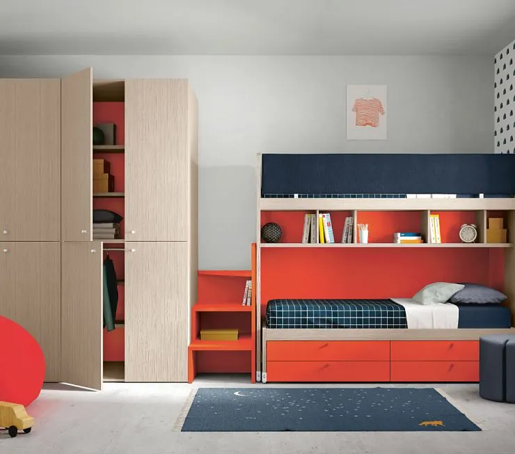 Детская стенка с двумя большими шкафами, двумя кроватями и полками для книг. Ступени на верхнюю кровать - они же полки для игрушек. Нижняя - выдвижная и под ней выдвижные ящики для игрушек. Яркий дерзкий окрас не даст загрустить. Мягкий пуф тоже в комплекте. Приобретается под заказ по размерам вашего помещения, по цене фабрики изготовителя.