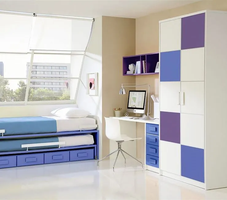 Детская для двоих мальчиков. Состоит из двустворчатого шкафа с распашными дверями, письменного и стола для компьютера, подвесной полки для книг. Главная фишка - раздвижная кровать. Если для активной игры нужно больше пространства, меньшая убирается под большую, под ней ещё четыре ящика для игрушек. Цена производителя, изготовление под заказ.