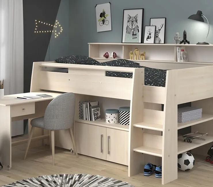 Оригинальный и функциональный детский гарнитур, объединяющий кровать, шкафчики, тумбу, стеллаж и парту. Экономит пространство, организуя сразу 3 зоны: для учебы, игр и хранения вещей. Выполнен из качественного австрийского ЛДСП бежевого оттенка. Кровать-чердак делается по размерам клиента, понадобится выезд специалиста для замера.