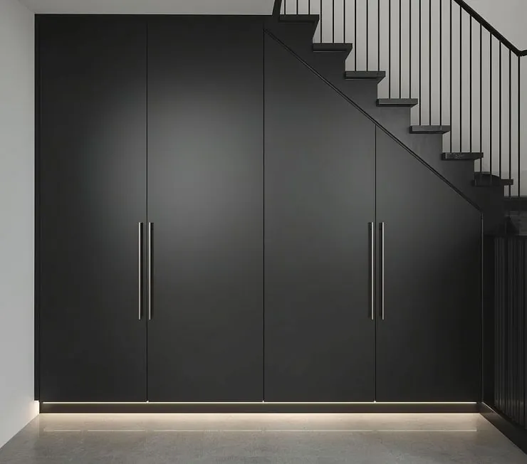 Стильный встроенный шкаф под лестницей в матовом графитовом цвете. Гладкие фасады без видимой фурнитуры, с длинными вертикальными ручками из нержавеющей стали, создают современный лаконичный образ. Низ конструкции оснащён мягкой LED-подсветкой, подчёркивающей геометрию и добавляющей уюта.