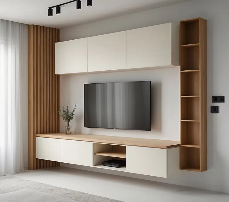 Современная настенная композиция в стиле минимализм, выполненная в светлой матовой отделке с акцентами под натуральное дерево. Комплект включает навесные закрытые шкафы, ТВ-зону с нижним модулем и открытой нишей под приставку, а также вертикальный стеллаж с полками. Идеальное решение для небольших гостиных — лёгкий, функциональный и эстетичный.
