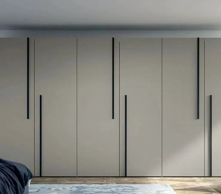 Оригинальное дизайнерское решение - расположить вертикальные ручки сверху и снизу - превращает этот шкаф в элегантный образец лаконичного минимализма. Включает 3 полноразмерные секции с распашными фасадами из МДФ в матовой эмали. Нейтральный оттенок шкафа подойдет для интерьера в почти любой цветовой гамме. Производится в индивидуальных размерах под заказ.