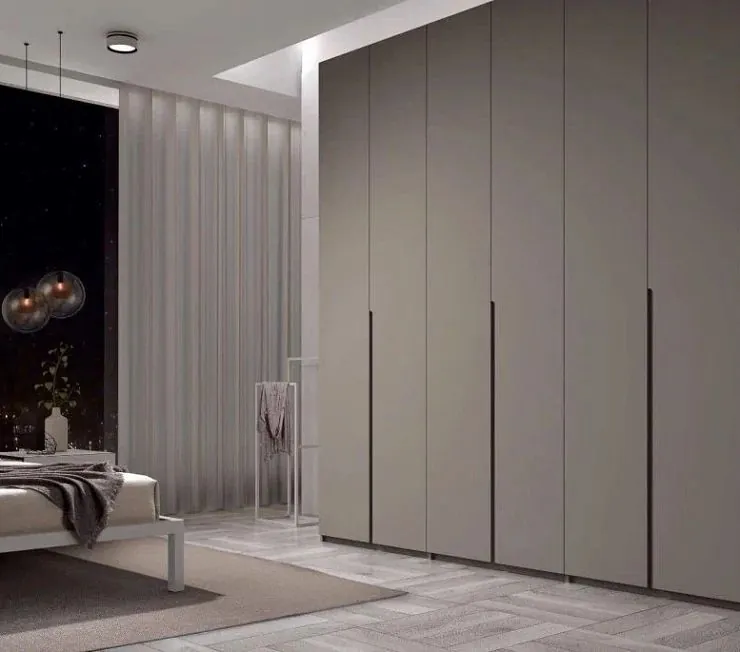 Только функциональность, удобство использования и ничего лишнего. Сверхминимализм в формах подчеркнут симметрией и гладкой поверхностью фасадов МДФ в серой эмали. Шестистворчатая модель с интегрированными ручками комплектуется оригинальной австрийской фурнитурой “Хеттих”. Эксклюзивное производство, необходим замер размеров помещения.