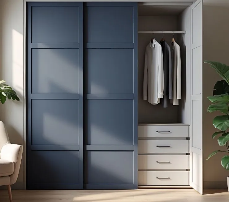 MODENA — это минималистичный, но функциональный шкаф-купе, выполненный в насыщенном матовом синем цвете с элегантной филёнкой на фасадах. Идеальное решение для современной спальни или гардеробной. Внутри — удобная система хранения: штанга для одежды и вместительные ящики с лаконичными ручками.
