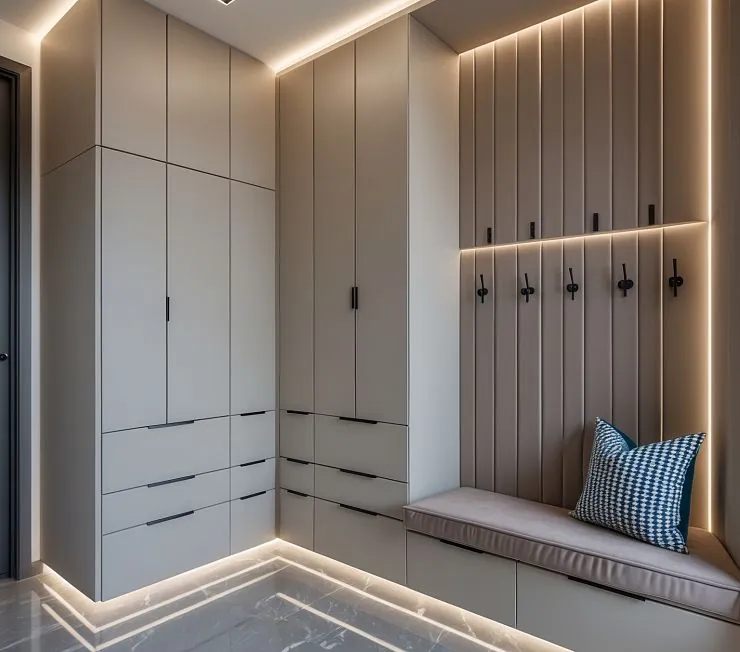 Стильная угловая прихожая в современном исполнении, идеально подходящая для просторных квартир и частных домов. Мягкие вертикальные панели с интегрированной LED-подсветкой создают уютную атмосферу и акцентную зону для ожидания. Черные металлические крючки расположены на удобной высоте, а просторная скамья с кожзамовым или тканевым сиденьем имеет выдвижные ящики для обуви. Вместительные шкафы обеспечивают хранение верхней одежды, аксессуаров и бытовых мелочей, сохраняя идеальный порядок. Контурная подсветка по цоколю добавляет интерьеру эффект легкости.