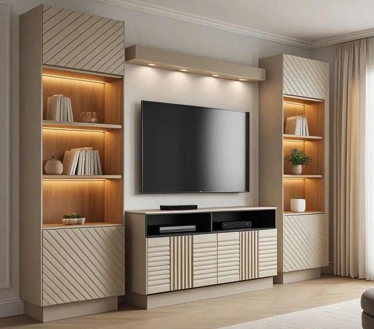 Элегантная стенка для гостиной в светло-бежевых тонах с выразительными рельефными фасадами. Центральная тумба дополнена двумя вместительными стеллажами с подсветкой и открытыми нишами, идеально подходящими для декора и книг. Матовое покрытие и светлая древесная текстура придают композиции лёгкость и актуальность.