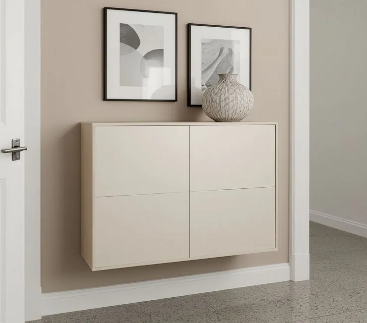 Легкий и компактный обувной шкаф с четырьмя равномерно распределёнными отсеками. Сатиновая отделка в бежевом цвете придаёт изделию благородный вид, а навесная конструкция делает его идеальным решением для малогабаритных прихожих. Чистые линии, скрытая фурнитура и функциональный дизайн подойдут для современных и скандинавских интерьеров.